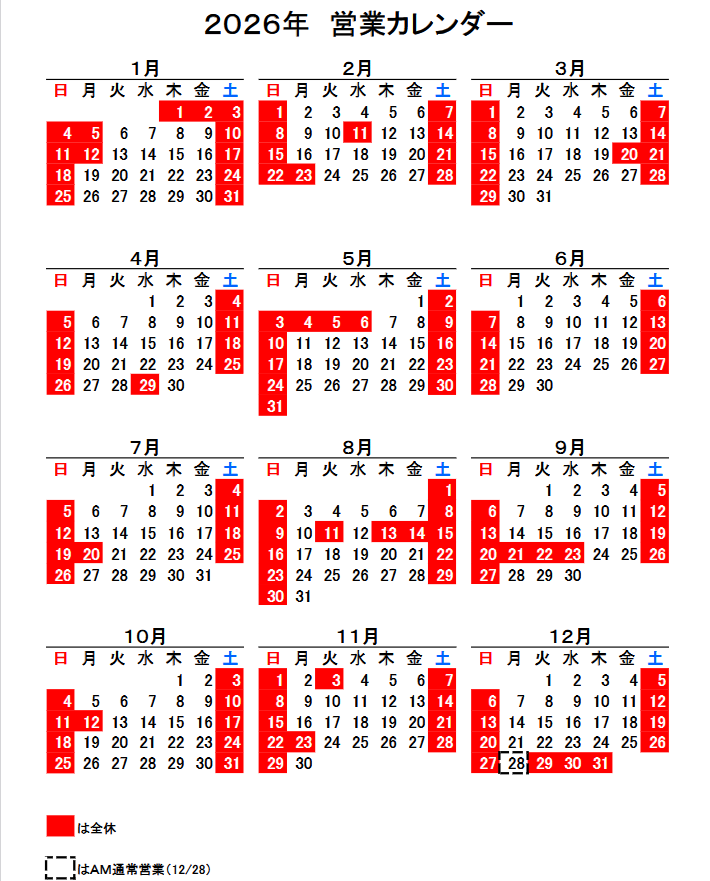 2026年 営業カレンダー